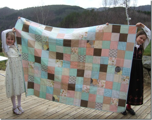 Konfirmanten fekk hekleteppet frå forrige innlegg, dåpsbarnet fekk eit lite lappeteppe.